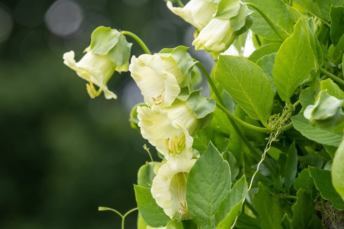 Native to Mexico and South America, this tender perennial is most often grown as an annual. Large showy cup or bell-shaped flowers are framed by saucer-like green petals, hence its common name. Blooming from summer into fall, the honey-scented flowers start out pale green, turning white or purple as they mature. Grow along a fence or on a sturdy trellis or arbor that is strong enough to support its weight.