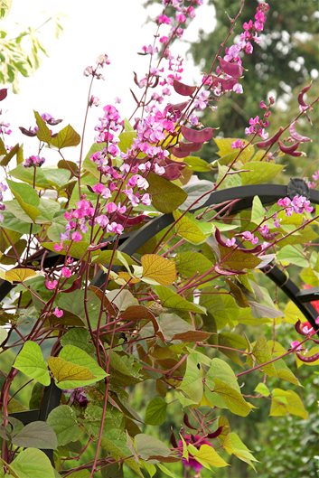 Hyacinth bean is grown for its ornamental attributes of purple-tinged heart-shaped leaves, red stems, and pea-like blooms. The bright burgundy pods are edible, along with the shelled beans. The fragrant flowers, attractive to hummingbirds and insect pollinators, occur in shades of rose-purple, pink, or white. Provide a strong structure to support the weight of this quick growing vine. Use as screening, on arbors, fencing, or pergolas.