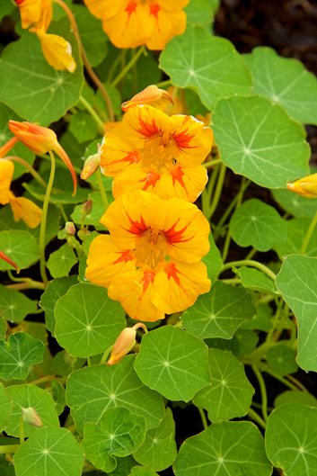 A staple of kitchen and cottage-style gardens, nasturtium is grown for its rounded foliage and endearing tubular flowers. Blooms, which appear from late spring to fall, occur in a range of rich jewel-like colors, including orange, red, yellow, apricot, pink, purple, cream, and patterned bicolors. Foliage can be green or variegated. Use this carefree annual to edge kitchen plots, allow to spill over rock walls, plant in a hanging basket, or grow up a small trellis. The leaves and flowers are edible.