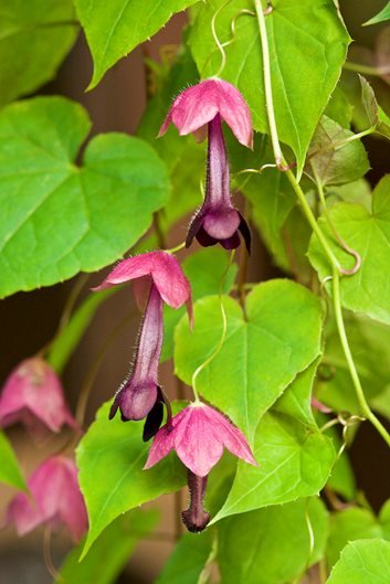 Also known as five-leaf akebia, this deciduous woody vine is named for the dangling clusters of deep purple flowers and chocolate fragrance. The flowers, which appear from early to mid-spring, are followed by violet sausage-shaped seed pods. This vigorous grower needs strong support and judicious pruning to keep it in check. Foliage is semi-evergreen in warmer climates. Use as screening or to cover an arbor or pergola, or plant as a groundcover along a slope for erosion control.
