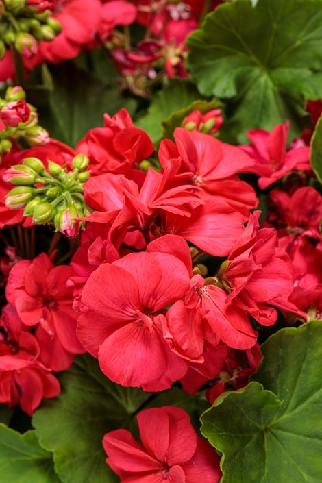 Zonal geraniums are the colorful backbone of many summer gardens. Named for the zone of darker color on the leaf, which is very pronounced in some plants, but less visible in others. They have succulent stems with rounded, light to deep green leaves that are often variegated with darker colors and have a pungent smell. Their flowers grow in clusters and can be single, semi-double, or double. Blooms come in shades of red, purple, pink, white, orange, and rarely yellow. Most zonals will grow to 24 inches tall and wide. There are dwarf and miniature varieties 5 to 8 inches in size.