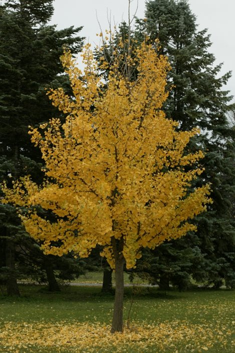 This intriguing tree is classified as a conifer, even though it loses its leaves in fall. Ginkgos are dioecious, with separate male and female trees. The unique leaves that resemble tiny fans turn brilliant yellow for several weeks in fall before they are quickly shed, leaving a carpet of gold on the ground. The foliage resembles the leaflets of maidenhair fern, hence the common name of maidenhair tree.