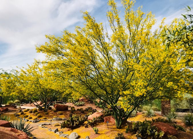 Parkinsonia is a common desert landscape tree, with a spreading canopy and yellow flowers. Native to the desert Southwest, palo verde is acclimated to hot weather and arid conditions. In extreme heat or drought, plants shed their leaves to conserve water. The green bark continues to perform photosynthesis and helps store water. Use as a focal point or street tree.