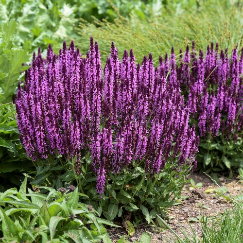 Salvia is a flowering perennial or annual that occurs in a wide range of colors and shapes. Distributed throughout the world, many species are native to hot, dry regions, with adaptive traits such as drought tolerance, deep root systems, and waxy or hairy leaves that reduce evaporation. Use in a xericape or containers. Read more on how to grow salvia.