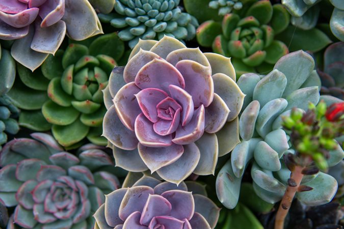 Native to dry regions of Mexico and Central America, Echeveria is a tender perennial succulent with colorful rosettes and flower stalks. Water is stored in the thick, fleshy leaves, which can have a waxy coating that reduces evaporation. Echeveria thrives on rocky outcrops, surviving with minimal water. Display in a rock garden, container, or xeriscape. Read more on growing echeveria.