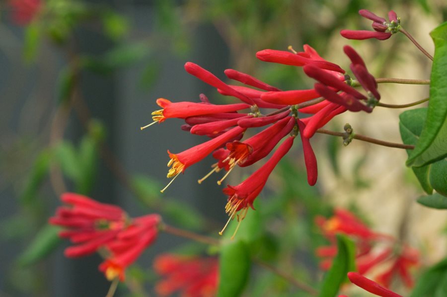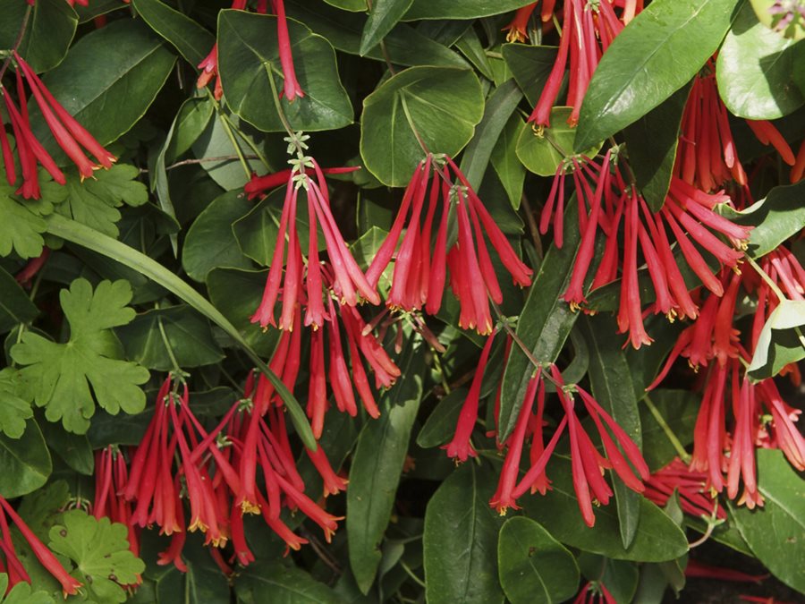 - Trumpet honeysuckle (L. sempervirens): Also known as coral honeysuckle, this medium-sized semi-evergreen vine produces lightly fragrant crimson flowers that open to reveal yellow throats. This southeastern U.S. native remains evergreen in warmer regions.