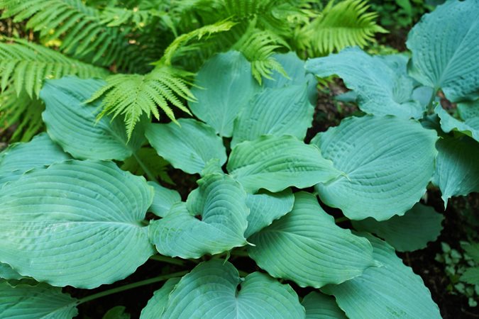 - Bold-leaved hostas provide contrast to lacy plants such as ferns and astilbe, or linear foliage such as sedges or liriope.