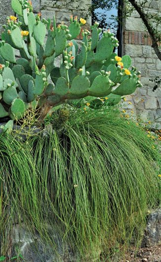 Cascading plants create the illusion of a spilling waterfall, especially when planted atop walls, where their flowing habit can be shown off to greatest advantage. Choose creeping groundcovers like silver ponyfoot (Dichondra argentea); sprawling perennials like prostrate rosemary; and grassy clumpers like spaghetti-leaved Texas beargrass (Nolina texana). Many succulents, too, evoke falling water: the steady, moss-green drip of string-of-pearls (Senecio rowleyanus); the splashing effect of upturned leaves on string-of-fishhooks (Senecio radicans); and the rivulets of bottlebrush-textured burro’s tail sedum (Sedum morganianum).