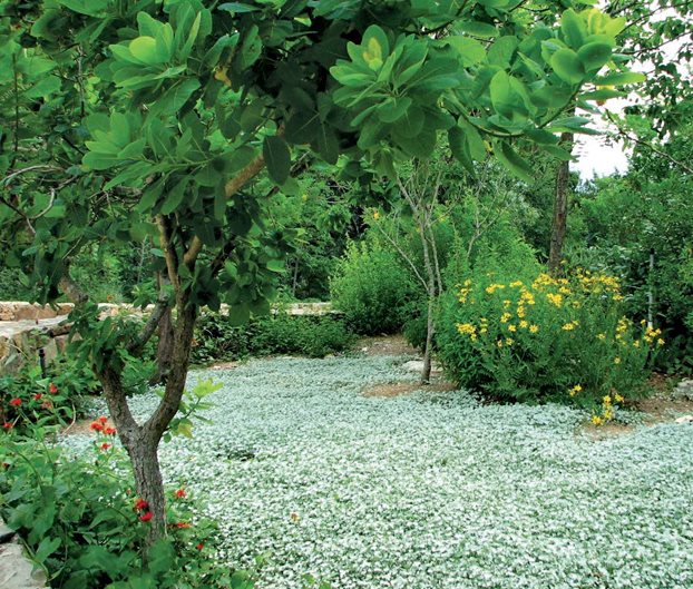 Mat-forming or creeping groundcovers with silver or blue-green foliage create the illusion of a limpid pool and make good lawn alternatives too. Try woolly stemodia (Stemodia lanata), with silvery green leaves; lamb’s ear (Stachys byzantina), with pettable, fuzzy foliage; and silver carpet (Dymondia margaretae), whose silvery white leaves lie flat on the ground. For a meandering stream, choose a long-blooming, small-to-medium-sized perennial with blue or purple flowers, and mass it by the dozens in a winding ribbon. Good candidates include blue false indigo (Baptisia australis), ‘May Night’ salvia, and lavender.