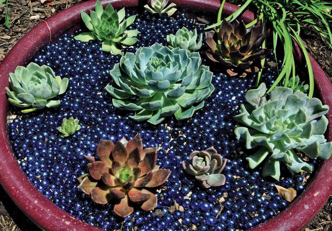 Massed in a rock garden, a colorful assortment of succulents can imitate an under-the-sea garden so convincingly that a clownfish might feel at home. This is a trick that only those in frost-free climates can pull off in in-ground gardens, but elsewhere you can use container plants and bring them indoors for winter. Look for clamshell-shaped paddle plant (Kalanchoe luciae); frilly echeverias, massed to resemble coral; many-armed squid and octopus agaves; and blue chalksticks (Senecio serpens) for soft-fingered anemones. Or make an ever-blooming, waterless lily pond by planting a bowl-shaped container with a handful of echeverias for the water lilies, mulched with blue glass for the water.