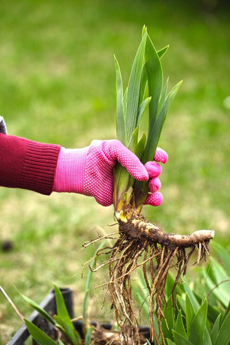 Rhizomatous types need to be divided every 3-5 years, typically soon after bloom time. A reduction in blooming or rhizomes being pushed up out of the soil can be signs that it’s time to dig them up and divide. If this is a dividing year, don’t cut the foliage back - so you know where they are. Dig the rhizomes up carefully and divide them by pulling apart with your hands. Some, however, may need to be cut with a knife. Healthy rhizomes will be approximately ¾ to 1-inch in diameter, with a good root structure and one to two leaf fans. Older or unhealthy (soft, rotting, or hollow) rhizomes should be discarded. Wash the roots with water and inspect for disease or pests, especially iris borer worms. Trim the leaves to 4 to 6 inches and re-plant as above, with the rhizome on a ridge and roots fanned out. Water newly planted irises well.