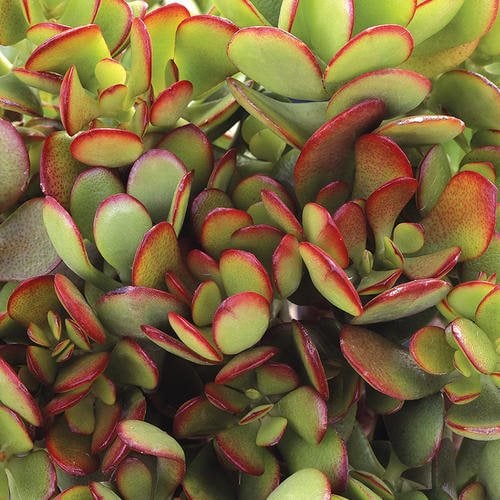 Thick fleshy leaves can be round, oval, irregular or crinkled, occurring in colors of green, gold, silver-blue and variegated, often with red or burgundy highlights.