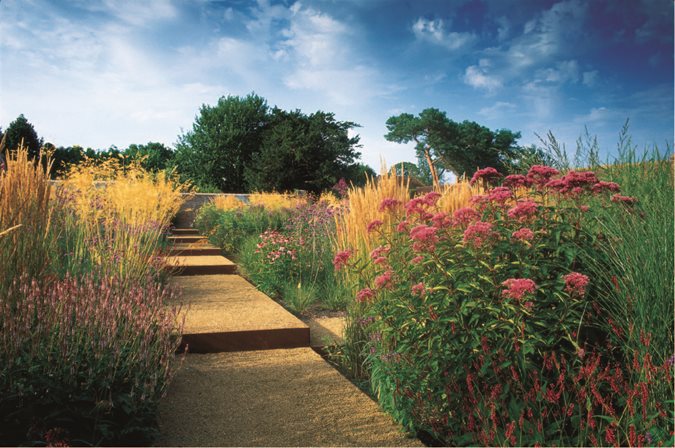 British designer Christopher Bradley-Hole used Joe Pye weed, drifts of grasses and other perennials to flank a grid of steel-edged garden paths.