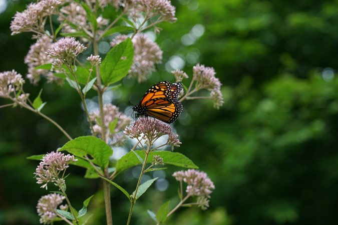A monarch enjoys the nectar of Eutrochium fistulosum (Joe Pye weed) in Rick Darke’s garden. Place a bench or chairs nearby so you can watch the show.
