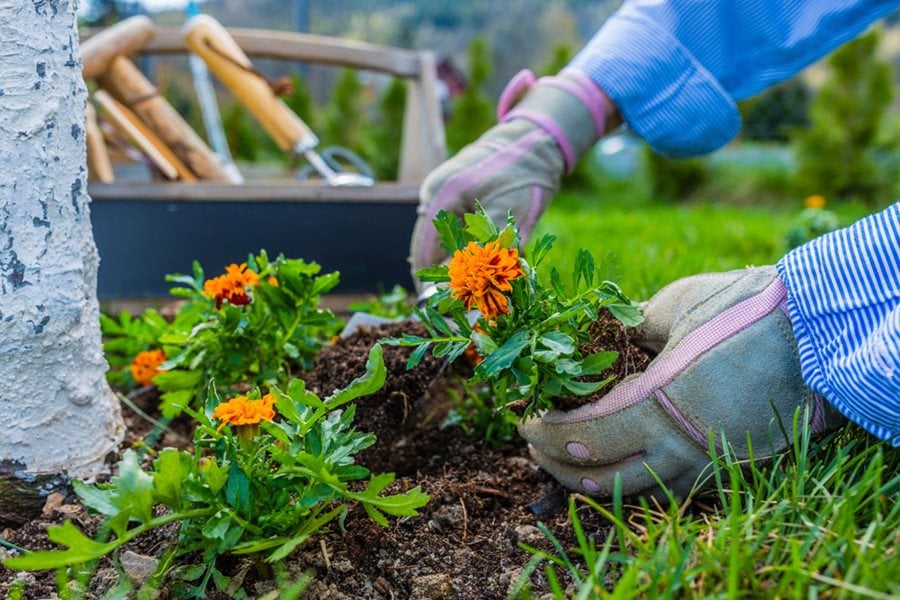 When transplanting marigolds purchased at a nursery, dig and loosen the soil about 6 inches down, with the final planting hole just slightly larger than the rootball. Backfill with soil and press firmly into place. Water thoroughly. Adding a 1 to 2-inch layer of mulch between the plants will help keep the soil moist and discourage weeds.