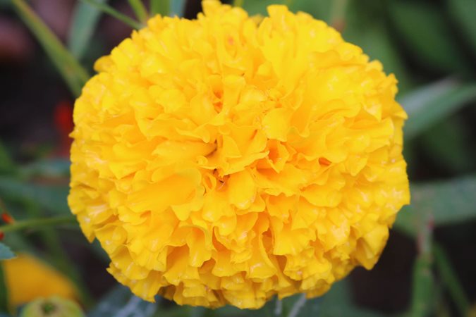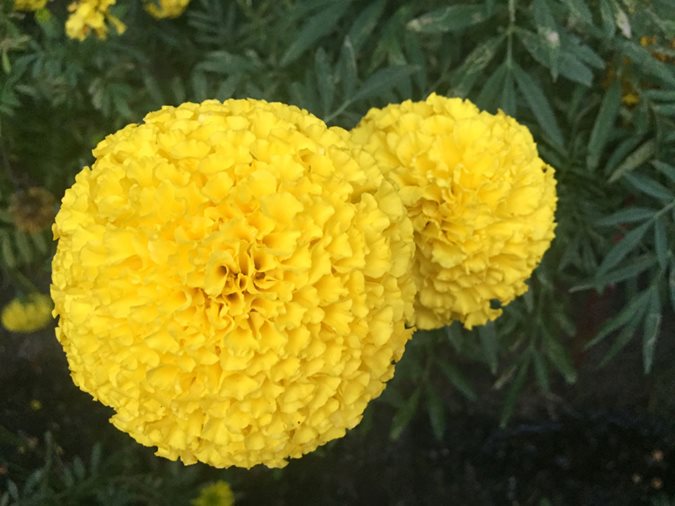 - African marigold (Tagetes erecta): These are the tallest variety of marigolds and range in height from 1 to 4 feet, and have a 1 to 2 foot spread. Their large flowerheads can reach up to 5 inches across, are densely double and pompon-like.