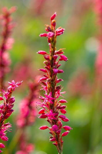For a pop of hot color that starts in June and lasts until the first frost, look no further than Persicaria ‘Firetail’. While not aggressive, this sturdy perennial likes a bit of room and will drift and weave amongst a border planting. The bottle-brush-like crimson flowers swaying above clumps of dark green lanceolate foliage add a textural dimension to a pond’s edge or in a prairie-style planting. It pairs wonderfully with contrasting-shaped flowers like purple coneflower (Echinacea purpurea), gray-head coneflower (Ratibida pinnata), or a finely textured grass like pink muhly (Muhlenbergia capillaris).