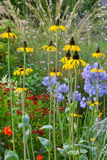 Not your grandmother’s black-eyed Susan, this robust American prairie native is a tour de force in the summer garden. In June and July, the hefty flowers emerge on stems that are nearly 5 to 6 feet, with drooping rays of yellow petals surrounding the very attractive dark brown center cones. The large flower is a favorite of many fauna, such as monarch and swallowtail butterflies, and hummingbirds. Though the flowers are often the focal point, the foliage is nothing to overlook with its powdery blue, tobacco-like leaves.