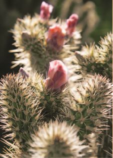 Attractive and shrublike, silver cholla cactus has a fierce yet compelling presence. Beware of its silvery long spines and numerous brown glochids (short hairlike spines) found in dense clusters at the base of the long spines.
