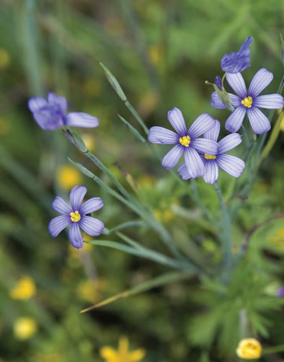Cheerful is an oft-used epithet to describe the starry blossoms of blue-eyed grass. Flower color varies from all shades of blue-violet to white—but always with a bright yellow center. This small perennial may be evergreen or summer deciduous and will seed about when situated in sunny gardens and heavy soils. For a classic combination, plant it with California poppy (Eschscholzia californica), yarrow (Achillea millefolium), arroyo lupine (Lupinus succulentus) and California buttercup (Ranunculus californicus).