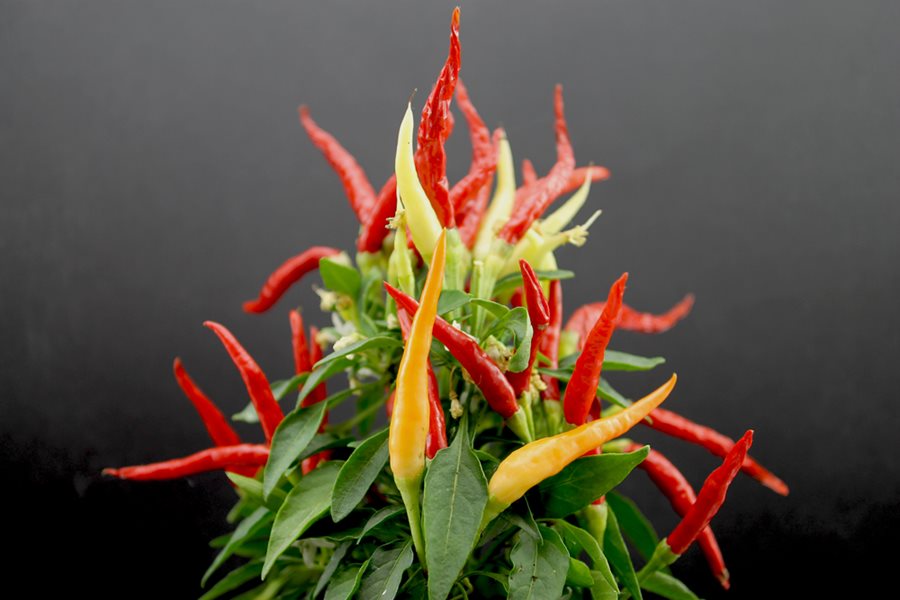 ‘Chilli Chili’ is the perfect name for these colorful little peppers, which have been bred to be heat-free so they are safe for households with children. The fruit, which is held upright above the foliage, changes color from yellow-green to orange to red as it matures, with all colors on exhibit simultaneously. The plants barely reach a foot tall, making them an eye-catching addition to containers and the front of the border.