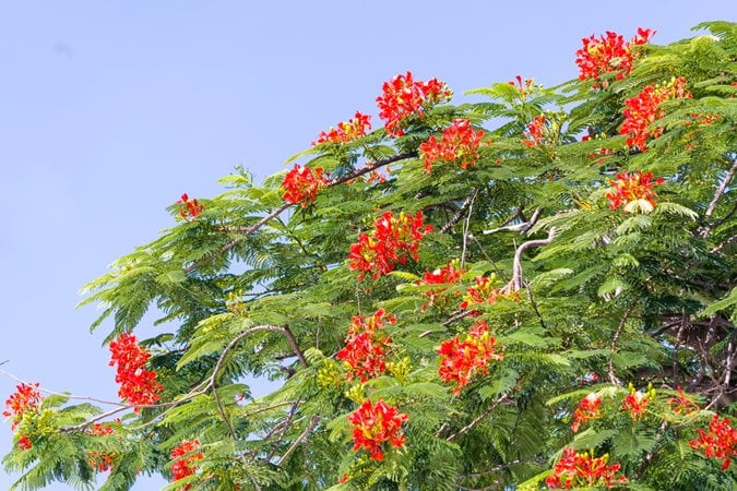Mexican bird of paradise is an evergreen shrub or small tree that produces thorny foliage and clusters of orange-red flowers. The showy blooms, which are especially attractive to butterflies and hummingbirds, are followed by curly seed pods. Its smaller stature is suitable for small urban lots. Use as a background element or focal point in the landscape. (It is toxic to dogs and cats.)