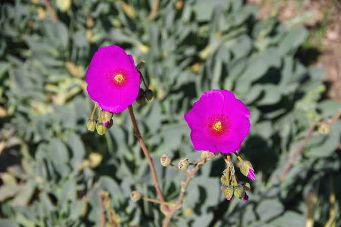 Native to Chile, rock purslane is a perennial succulent with fleshy gray-green leaves and cup-shaped magenta flowers that grow on long thin stems above the foliage. Flowers bloom over an exceptionally long time, from spring to fall. Mass as a ground cover along a foundation, at the front of a border, or as edging.