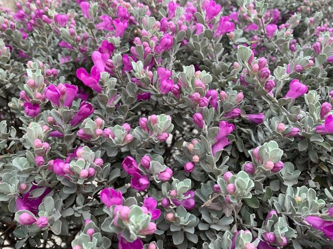 This evergreen shrub, native to Texas, is a common landscape plant grown for the soft silvery foliage and tubular rose-purple flowers, which typically appear after it rains. Use as a background element in beds and borders, in foundation plantings, as hedging or screening.