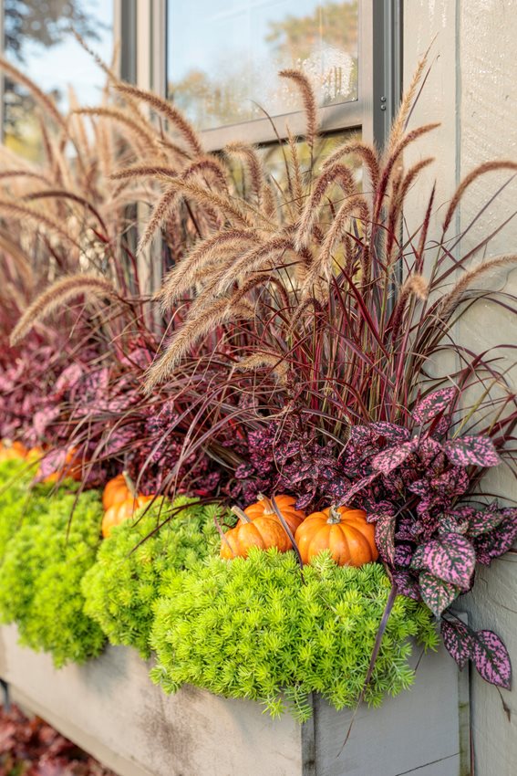 Window box with Hippo® Rose, Lemon Coral® sedum, and Graceful Grasses ® purple fountain grass. Photo by Proven Winners.