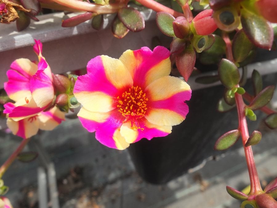 - Hang a basket of trailing portulaca on a shepherd’s hook and place near a sunny patio or deck to enjoy the flowers up close. Move around the yard for a different look.