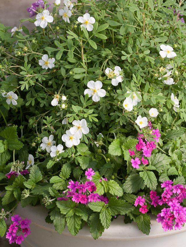 Combine Happy Face® White potentilla with Superbena® Pink Shades for bright summer color. Photo by Proven Winners.