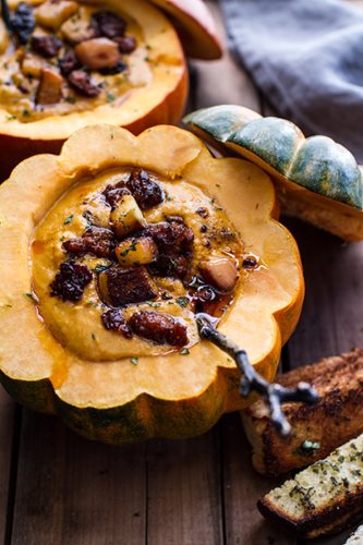 This roasted garlic sage pesto pumpkin soup with spicy fried pumpkin seeds is the perfect meal for a cool autumn day—to increase the festive feel, serve in hollowed out small pumpkins. Photo by: Tieghan Gerard.