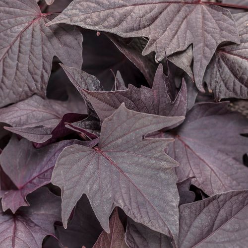 This fast growing ornamental vine, most often grown as an annual, is valued for the decorative leaves that come in a wide array of colors and shapes. Sweet Caroline Bewitched After Midnight™ produces maple-like purple foliage. ‘Blackie’ has shiny maple-like leaves that are nearly black. Learn more about growing sweet potato vine.