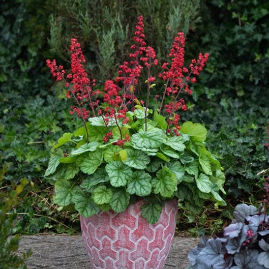 Grown primarily for the foliage, coral bells come in a nearly endless array of colors, patterns, and forms. This durable perennial is tolerant of a wide range of light and soil conditions. Use in mixed borders, mass plantings and containers. Learn more about growing coral bells.