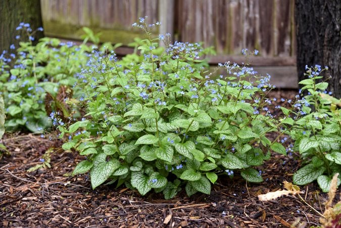 Also known as false forget-me-not, the clusters of tiny blue flowers resemble true forget-me-nots. The attractive heart-shaped leaves are green, white, gold, or silver patterned, brightening up shady areas. Use this easy-care perennial in a mixed border, as edging, or in mass plantings. Learn more about growing brunnera plants.