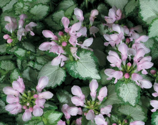 This vigorous ground cover produces silver, white, gold, or variegated foliage that lights up shady areas. Hooded tubular flowers occur in colors of pink, white, lavender, or yellow. Use this quick growing creeper in difficult sites such as underneath trees or in dry shade. Plant as edging or in containers.