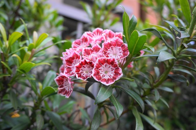 Mountain laurel, native to woodlands of eastern North America, is known for the attractive clusters of flower buds that open to cup-shaped flowers. Blooms come in shades of pink, red, or white, some with striking patterns. This broadleaf evergreen with rhododendron-like foliage can be used in shrub, woodland, or mixed borders. Plants can tolerate more sun in cool climates. In warmer regions, plant in a site that receives morning sun and afternoon shade, or dappled shade throughout the day.