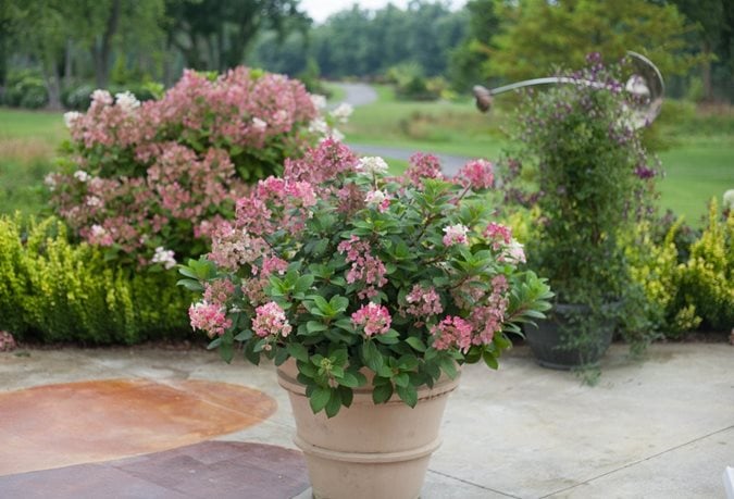 A favorite summer-blooming shrub, with dwarf varieties such as Little Quick Fire® or Invincibelle Wee White® performing well in containers. Long-lasting flowers in an array of colors are eye-catching by themselves or when underplanted with impatiens, begonias, ferns, or lady’s mantle. Learn more about growing hydrangeas.