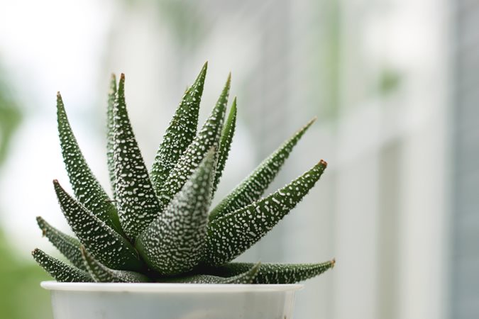 Cute and compact, this slow-growing succulent forms attractive rosettes of fleshy green leaves accented by bands of pebbly white speckles. Will tolerate low light, but prefers moderate to bright indirect light. Ideal for terrariums or any windowsill where it won’t receive direct sunlight.