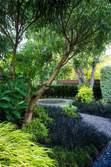 Hall-Behrens set to work cleaning out the thick, mid-layer of the garden. Then she planted sweeps of texture and color to create a visual link between various planting areas. The repetition of black and green mondo grass, with masses of ‘All Gold’ Japanese forest grass (Hakonechloa macra), unifies the plantings and reduces maintenance. To keep the garden looking lush for much of the year, she emphasized foliage texture over flower. And to keep things tidy, she confined annuals to containers, edged paths and beds in steel to keep gravel and soil in place, used plenty of hardscape, and chose small evergreens that don’t need much pruning. She also created definition with pots and architecture as well as plants.