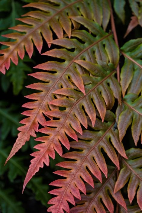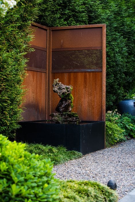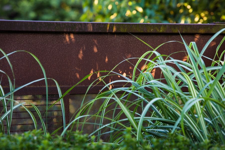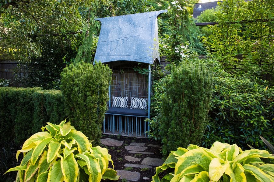 With the renovation, Hall-Behrens returned to her garden’s Pan-Asian-Tropical-style roots. This meant sticking more closely to a palette of Asian flora, along with plants from Chile and New Zealand, all well suited to Portland’s mild climate. Her enthusiasm for tropical-looking plants (“I love big foliage, just love it”) and the work of Brazilian landscape architect Roberto Burle Marx inspired the garden’s layout, pattern, and bold foliage, like windmill palm (Trachycarpus fortunei), cannas, bear's breeches (Acanthus mollis), and groves of hardy Japanese bananas. The look is symmetrical without being formal, comfortably eclectic, and modernist without the hard edges. Also following a limited palette, the structural elements of the garden are black, rusty metal, or peacock blue, similar to the arbor-like structure painted to match the home’s trim color. “I’ve always been enamored by steel,” says Hall-Behrens, who uses rusty and perforated versions for edging, fences, and screens.