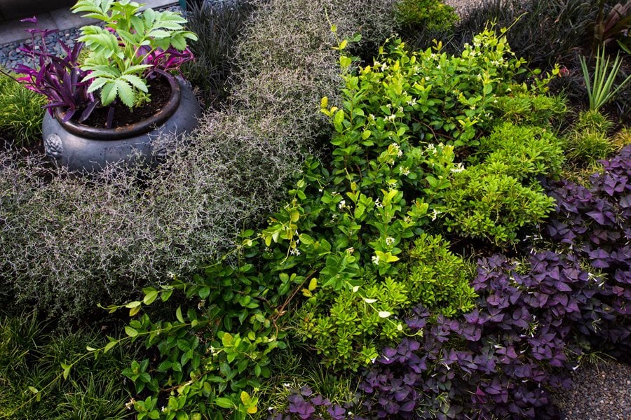 The garden’s bones were good—a network of gravel pathways, maturing trees like Italian cypress and ‘Natchez’ crape myrtle, and a hefty stand of Japanese banana (Musa basjoo). But Hall-Behrens had lost track of her original idea of creating a contemporary, Pan-Asian-Tropical-style garden. “I like to use more plants than most modern garden designers do,” she explains of her dilemma.