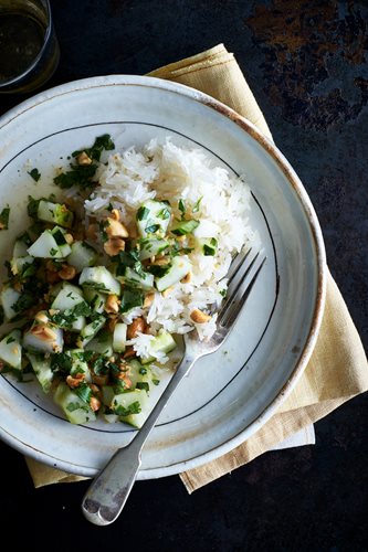 Gardener, cook, and forager Laura Silverman shares a recipe for spicy cucumber salad.For fresh, crisp cucumber pleasure, I look no further than an excellent Thai salad that offers crunchy morsels of raw cucumber tossed in an addictive dressing that balances the tang of lime juice with the funk of fish sauce. Sweetly aromatic sticky rice is the perfect foil for these bright flavors. I could eat a big bowl of this every day of the summer.