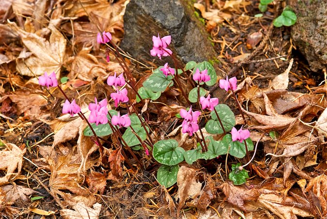 This diminutive plant grown from tubers begins growing in fall, going dormant during warm summer months. Lightly scented flowers have elegant upswept petals in shades of white, pink or purple that complement the intricately patterned leaves. Species such as Persian violet (Cyclamen coum, pictured) and alpine cyclamen (C. alpinum) bloom from late winter into spring, adding early season color to the landscape.