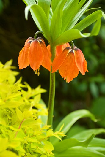 The nodding bell-shaped flowers of Fritillaria add a unique touch to the spring garden. There are more than 100 species, ranging from the diminutive Michael’s flower (Fritillaria michailovskyi) to the bold upright stands of crown imperial (F. imperialis, pictured). Flowers occur in colors of white, yellow, chocolate, orange, red, and purple, some with patterns or bicolors. This underutilized bulb deserves wider use in the landscape.