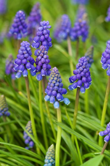 Grape hyacinth is named for the tiny clusters of fragrant flowers that resemble grapes. The deep blue flower coloring is highly coveted, complementing many other spring blooming bulbs such as daffodils and tulips. Other Muscari species occur in shades of white, pink lavender, or yellow. Mass bulbs in groups of 25 or more for the best effect. Easy to grow, hardy, and reliable.