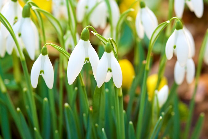 Snowdrops are among the first spring bulbs to flower, and are named for their appearance in February and March when snow is still on the ground. Tiny bell-shaped flowers borne singularly on slender stems are white, some with green markings. Common snowdrops (Galanthus nivalis) are grown most often. Bulbs can be short-lived in zones higher than 7. Plant in drifts for the best effect.