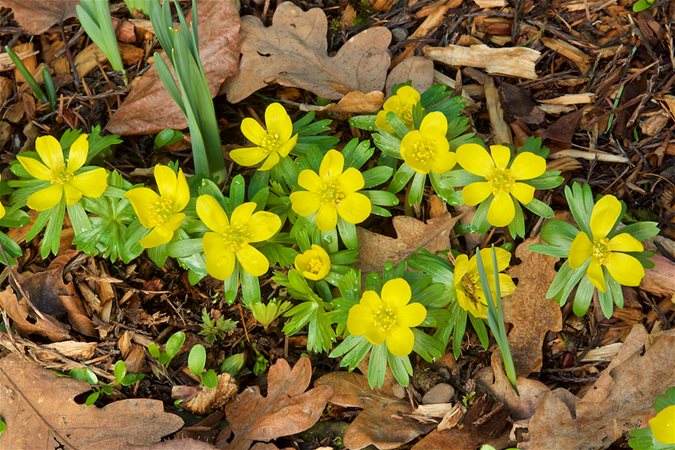 This early blooming groundcover bursts from the ground in late winter or early spring, even before the first crocus. Cheerful yellow buttercup-like flowers are surrounded by a collar of divided leaf bracts, with dark green foliage emerging after the flowers fade. Winter aconite spreads readily, combining well with other early bloomers such as snowdrop, species crocus, and hellebores. Mass in the landscape for the greatest impact.