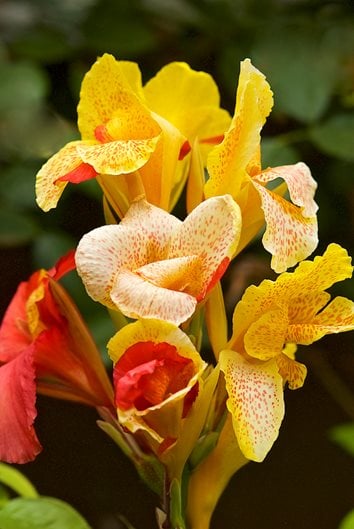 Not a true lily, cannas are produced from rhizomes and are related to bananas and flowering ginger. The bold foliage with striking patterns and colors lends a tropical feel to the landscape. Flowers occur in hues of red, pink, coral, white, yellow, and orange. Rhizomes can be left in the ground in warmer regions. In colder areas, bring pots inside or lift rhizomes to store indoors.