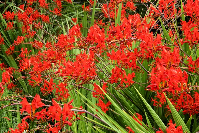 Also known as montbretia, this iris relative produces strappy foliage and stately flower spikes in sunset hues of red, orange, yellow, and coral. The small rounded corms can be left in the ground in warmer climates or dug and stored over winter. Plants need good drainage.